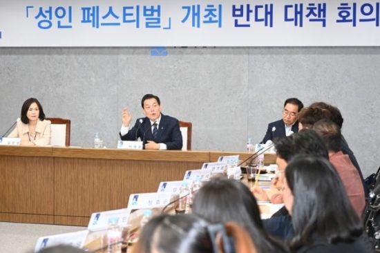 성인 페스티벌 반대 회의 중인 이재준 경기 수원시장. [사진=수원시] |