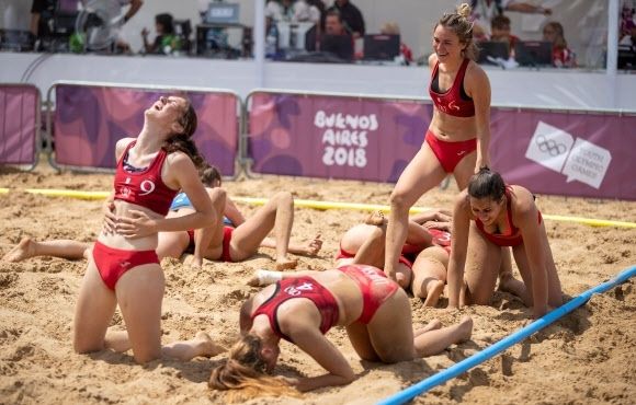 크로아티아 선수들이 아르헨티나 부에노스 아이레스에서 열린 ‘청소년 올림픽 게임’ 비치 핸드볼 여자 토너먼트 네덜란드와 크로아티아 준결승전 중 모래 위를 뒹굴며 기뻐하고 있다. EPA 연합뉴스 자료사진