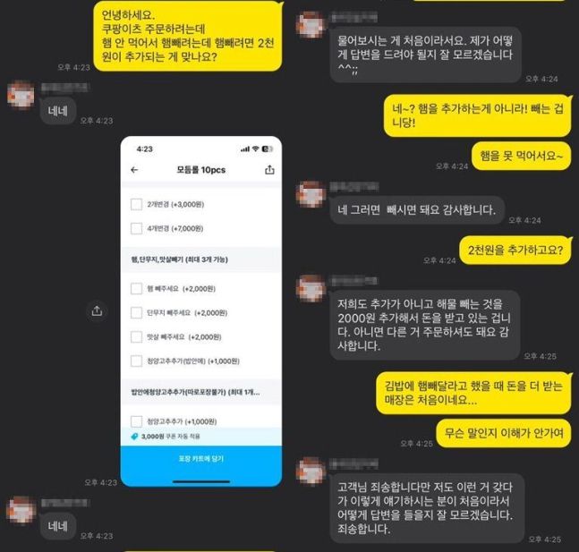 A씨가 “햄을 빼는 데 왜 돈을 추가해요?”라고 묻자, 가게 사장은 “물어보시는 분이 처음이라서요. 제가 어떻게 답변을 드려야 될지 잘 모르겠습니다”라면서 “아니면 다른 거 주문하셔도 된다”고 답했다.
