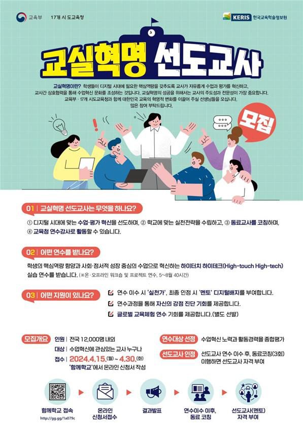올해는 1만1500명을 공모 등으로 선발할 예정이며, 희망자는 이달부터 <함께학교> 누리집(https://togetherschool.go.kr)을 통해 신청할 수 있다. 한 달간 공모 후 교육부와 시도교육청이 공동 심사하여 5월 중에 선도교사 연수 대상자를 선정한다.