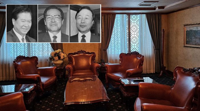 VIP용으로 쓰였던 대전 유성호텔 313호 응접실. 작은 사진은 왼쪽부터 김대중 전 대통령, 김종필 전 국무총리, 김영삼 전 대통령 | 대전시 제공