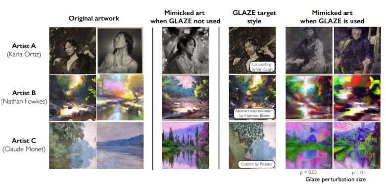 글레이즈는 사람의 눈에 띄지 않고 AI 모델의 해석을 조작하는 방식으로 이미지 픽셀을 미묘하게 변경, 스타일 카피를 막는 도구로 화제를 모았다.