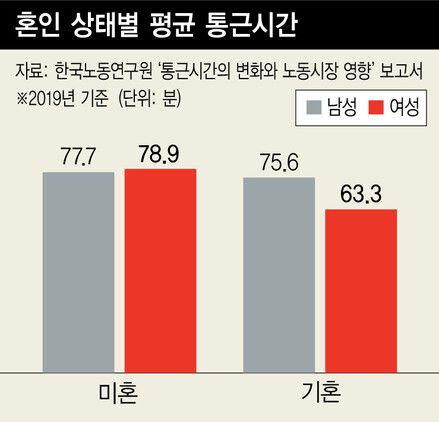 16일 한국노동연구원의 ‘통근시간의 변화와 노동시장 영향’ 보고서(연구책임자 손연정 연구위원)를 보면, 통계청의 생활시간조사 원자료와 한국노동패널조사 등을 분석한 결과 결혼 여부는 여성의 통근시간에만 영향을 미치는 것으로 나타났다. 2019년 기준 미혼 여성의 출퇴근시간은 78.9분으로 남성(77.7분)보다 1.2분 길었는데, 기혼 여성의 통근시간은 63.3분으로, 남성(75.6분)보다 오히려 12.3분 짧았다. 보고서는 “기혼 여성의 가정 내 시간 배분과 밀접한 관련이 있을 것으로 추측된다”며 “일반적으로 여성에게 가정의 가사 부담이 가중되기 때문에 기혼 여성은 상대적으로 출퇴근시간이 짧은 일자리를 선호하게 되기 때문”이라고 해석했다.