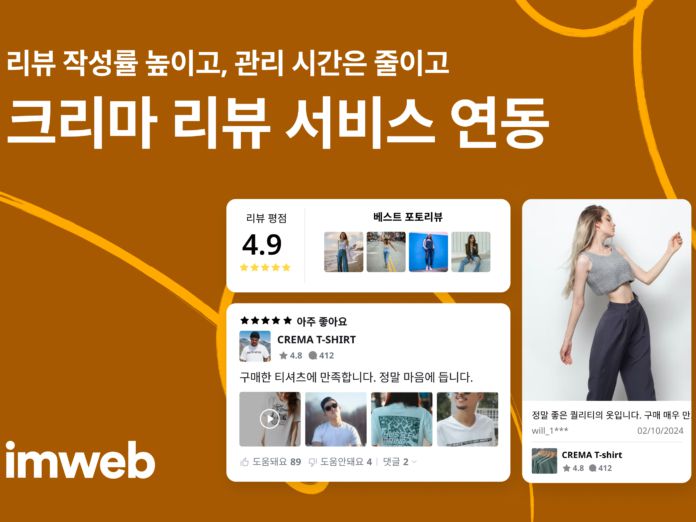 브랜드 빌더 ‘아임웹’(대표 이수모)은 쇼핑몰 리뷰 관리 솔루션 기업 ‘크리마’(대표 김윤호, 민준기)와 제휴를 맺고 고객 브랜드에 크리마의 쇼핑몰 리뷰 서비스 연동을 지원한다고 17일 밝혔다. 이번 제휴를 기념해 아임웹은 프로&글로벌 요금제를 이용하는 고객 브랜드를 대상으로 크리마 쇼핑몰 리뷰 서비스 1개월 무료 체험권을 제공한다.