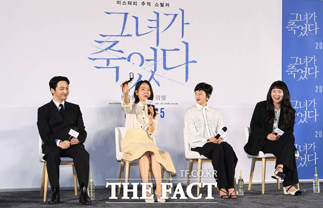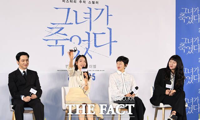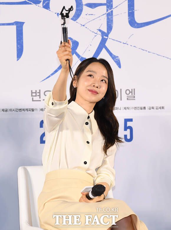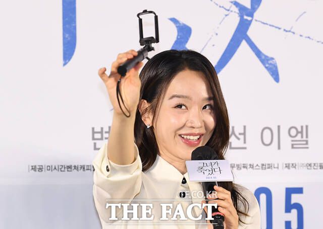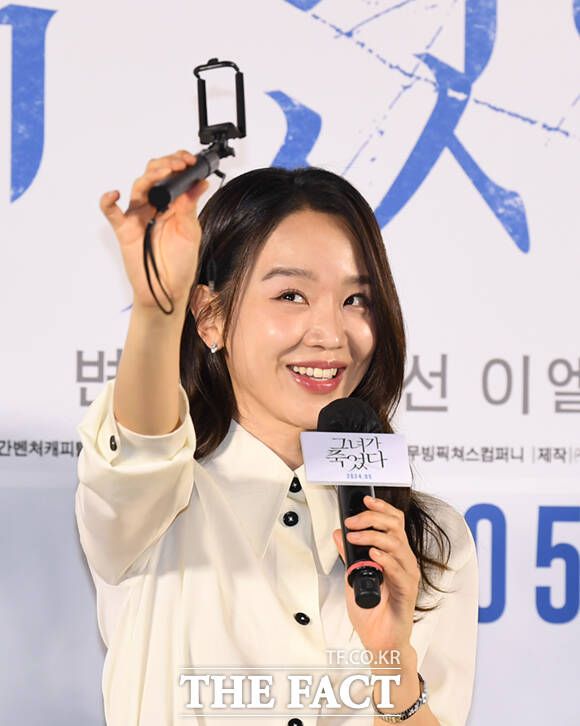 [더팩트ㅣ이새롬 기자] 배우 신혜선이 17일 오전 서울 성동구 메가박스 성수에서 열린 영화 '그녀가 죽었다' 제작보고회에서 셀카봉을 이용해 자신이 맡은 캐릭터를 표현하고 있다.
