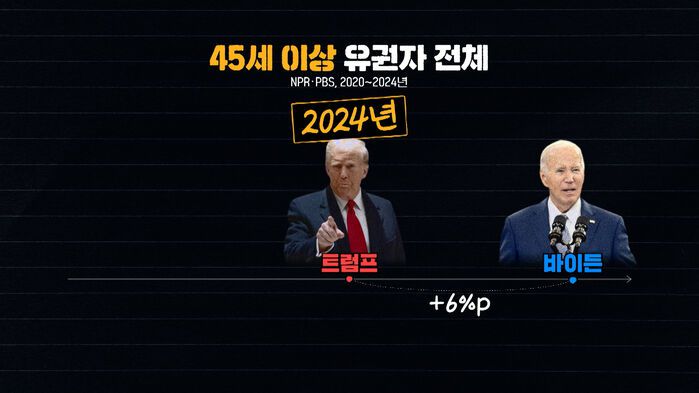 그다음에 또 재미있는 게 45세 이상 유권자들 사이에서도 바이든 지지가 2020년에 비해서 올라갔더라고요.