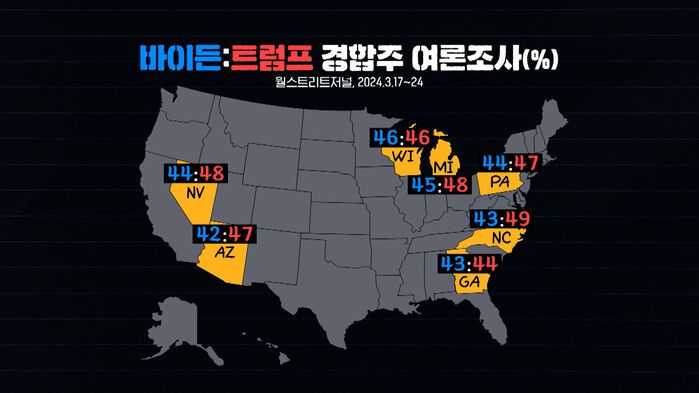 Q. 지난달 월스트리트저널 조사를 보니까 7곳 가운데 위스콘신만 똑같았고요, 나머지 6곳은 트럼프에게 2에서 5, 6%포인트씩 뒤지고 있었단 말이죠. 아직 경합주의 여론을 바꿀 만한 수준까지는 올라오지 못했다, 이렇게 봐야 될까요?