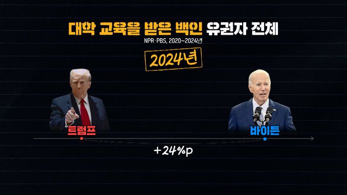 미국에서 4년제 대학을, 대학 교육을 받은 그룹에서 바이든 지지가 좀 높긴 했지만 더 올라갔고요.