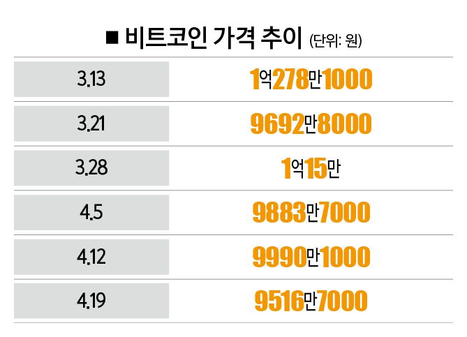 비트코인 가격이 반감기를 하루 앞두고 출렁이고 있다. 국내 가상화폐 거래소 빗썸에 따르면, 지난 12일 9990만1000원이던 비트코인 가격은 19일 오전 11시 20분 기준 8853만3000원으로 하락했다. 일주일 새 11.3% 하락한 셈이다. 최고점을 기록했던 3월 13일 1억278만1000원과 비교하면 13.8%(1424만8000원) 떨어진 수치다. 얼마 전까지 '뜨겁게' 달아올랐던 비트코인의 가격이 하락세를 타는 이유는 뭘까.