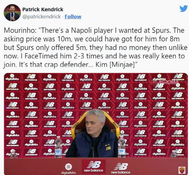 무리뉴 감독은 지난해 1월 기자회견서 "여러분들께 나폴리 선수 중 한 명 이야기를 들려주겠다"면서 토트넘 사령탑 시절 김민재 영입을 강력히 원했으나 토트넘 구단이 이적료 절반을 제시해 무산된 뒷얘기를 공개했다.