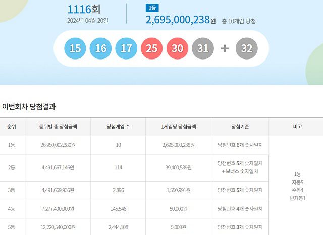 1116회 로또 당첨번호 '15, 16, 17, 25, 30, 31'…보너스 번호 '32'