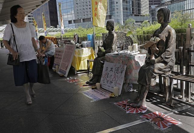 중국 내 일본군 ‘위안부’ 피해자 후손들이 중국 법원에서 일본 정부를 상대로 한 손해배상소송을 시작했다. 사진은 홍콩 주재 일본영사관 건물이 있는 육교 위에 설치된 2개의 소녀상. 2개의 소녀상은 각각 한국인과 중국인 위안부를 상징한다. [AP] |