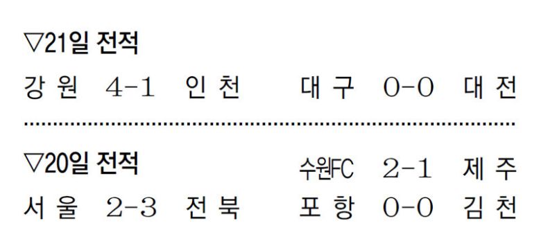 이날 대구는 최원권 감독 사퇴 후 치른 첫 경기에서 대전과 0-0으로 비겼다. 최 감독은 성적 부진에 대한 책임을 지고 19일 물러났다. 대구는 승점 7점(1승 4무 3패)으로 10위다. 승수 추가에 실패한 대전(승점 6점·1승 3무 4패)은 한 경기를 덜 치른 광주에 다득점에서 밀려 최하위(12위)를 벗어나지 못했다.