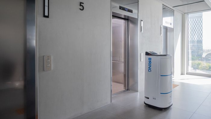 카카오모빌리티가 로봇 배송 서비스 ‘브링’을 출시했다. 이 회사의 자체 로봇 오픈 API 플랫폼 ‘브링온’과 결합된 LG전자의 신규 배송 로봇 ‘클로이 서브봇’이 엘리베이터를 탑승하기 위해 기다리고 있는 모습. 브링은 전용 엘리베이터가 필수적인 다른 로봇과 달리 플랫폼 제어를 통해 사무실·호텔·아파트·병원 등 로봇을 고려해 설계되지 않은 기존 건물에도 바로 배치해 운영할 수 있는 것이 특징이다. <사진=카카오모빌리티> |