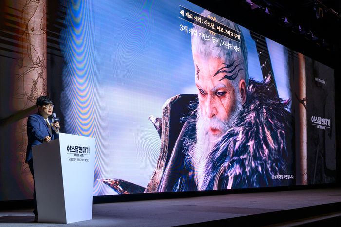 넷마블에프앤씨 장현진 개발 총괄이 ‘아스달 연대기: 세 개의 세력’에 대해 소개하고 있다. 사진 | 넷마블 |