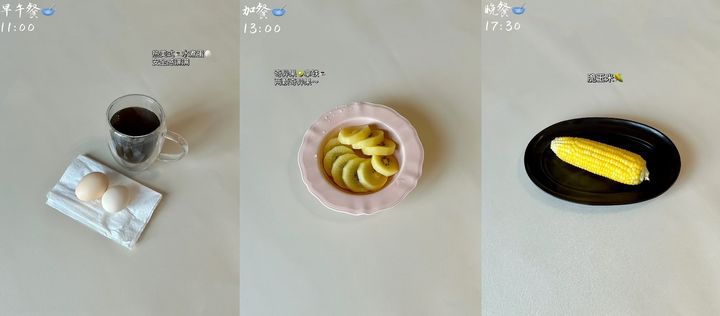 [서울=뉴시스] 최근 중국 젊은 여성들 사이에서 '체중 감량' 열풍이 불고 있다. 극단적으로 마른 몸을 위해 하루 식단을 과일 몇 조각과 커피로 채우는 식단이 유행하면서 우려의 목소리가 나왔다. 사진은 중국 여성이 인증한 하루 식단. (사진=샤오홍슈 갈무리) *재판매 및 DB 금지 |