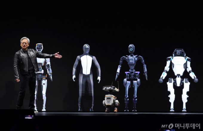 (새너제이 AFP=뉴스1) 박형기 기자 = 18일(현지시간) 미국 캘리포니아 새너제이 SAP센터에서 열린 엔비디아 개발자 콘퍼런스 ‘GTC 2024′ 기조연설에서 젠슨 황 엔비디아 최고경영자(CEO)가 차세대 로봇 개발 플랫폼 ‘프로젝트 그루트’를 소개하고 있다. 2024.03.18  ⓒ AFP=뉴스1  Copyright (C) 뉴스1. All rights reserved. 무단 전재 및 재배포,  AI학습 이용 금지. /사진=(새너제이 AFP=뉴스1) 박형기 기자