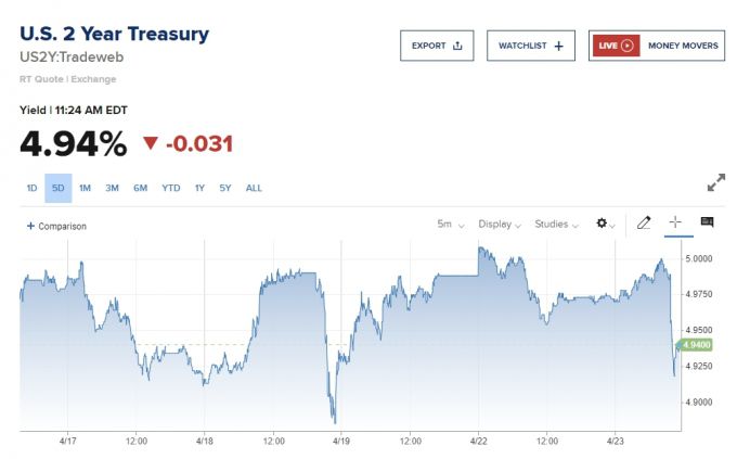 이날 미국 국채 단기물인 2년물의 수익률이 장중에 5.01%를 마크하며 지난해 11월 중순 이후 다시 5개월 여만에 5%대를 넘나들기 시작했다. 시장에서는 채권 트레이더들이 중앙은행의 금리인상 가능성을 수익률에 반영하기 시작했다는 분석이 나온다.