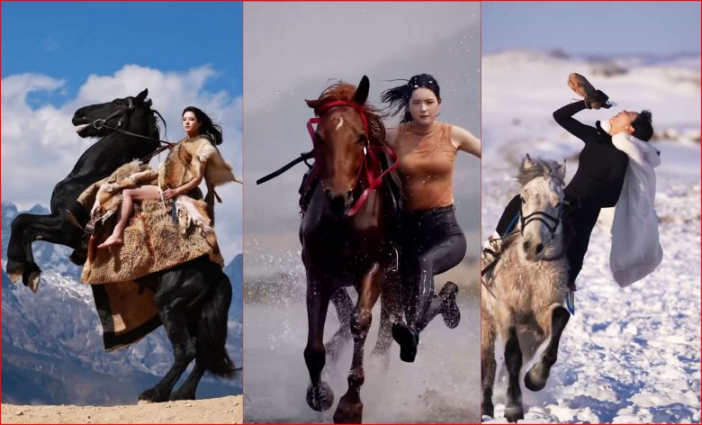 중국 랴오닝성 출신의 타오타오아이마(陶桃艾玛)가 물에서 때로는 설원에서 말과 함께 달린다. /인스타그램 @taotaoaima