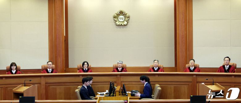 25일 헌법재판소 대심판정에서 민법 제1112조 등 유류분 제도에 대한 위헌법률심판 및 헌법소원 선고가 진행되고 있다. 2024.4.25/뉴스1 ⓒ News1 박지혜 기자