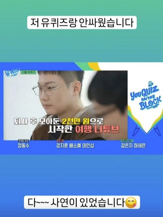 유퀴즈 예고편이 공개된 뒤 빠니보틀은 자신의 SNS(소셜네트워크서비스)에 관련 게시물을 올리며 "저 유퀴즈랑 안 싸웠습니다"라고 알렸다. 이어 그는 "다 사연이 있었다"고 부연했다.