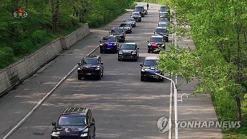 (서울=연합뉴스) 김정은 북한 국무위원장이 지난 25일 조선인민혁명군 창건 92주년을 맞아 김일성군사종합대학을 축하 방문했다고 조선중앙TV가 26일 보도했다. 김 위원장이 탄 아우루스 차량(가운데)이 신형 토요타 랜드크루저로 보이는 경호차량의 호위를 받으며 대학으로 향하고 있다. [조선중앙TV 화면] 2024.4.26