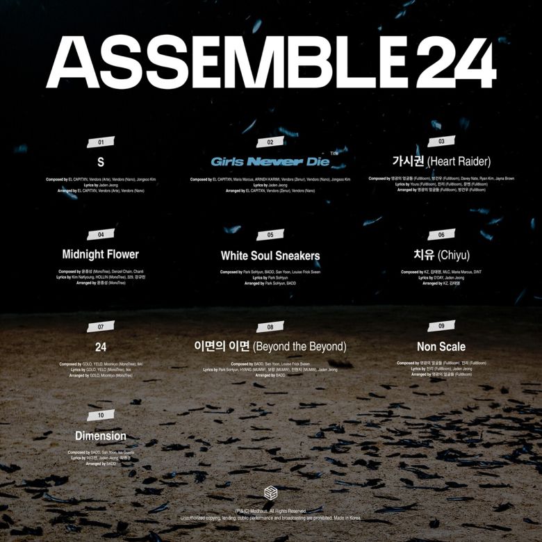 트랙리스트에 따르면 타이틀곡 'Girls Never Die'를 비롯해 'S', '가시권(Heart Rider)', 'Midnight Flower', 'White Soul Sneakers', '치유(Chiyu)', '24', '이면의 이면(Beyond the Beyond)', 'Non Scale', 'Dimension' 등 총 10개의 매력적인 곡들이 수록된다. 트리플에스 어셈블24는 오는 5월 8일 첫 앨범을 발매하고 글로벌 웨이브(WAV, 팬덤명)들과 만날 예정. 특히 'Girls Never Die'의 경우 전 세계 웨이브들이 그래비티를 통해 낙점한 타이틀곡이란 점에서 더욱 기대를 모은다. 아울러 'Girls Never Die' 외에도 'S', 'Dimension' 등 트리플에스의 특별한 세계인 코스모스(COSMOS)를 엿볼 수 있는 트랙명이 베일을 벗으며 호기심을 증폭시키는 중이다. 트리플에스는 완전체 데뷔를 앞두고 다양한 콘텐츠들로 팬들과 소통하고 있다. 특히 '지금까지 세상에 없던 아이돌'의 등장을 선언한 만큼, 트리플에스 어셈블24의 발걸음에 글로벌 웨이브의 특별한 시선이 모이고 있다. 한편 트리플에스는 지난해 '2023 MAMA AWARDS'에서 여자 신인상을 품에 안았으며, '31주년 한터뮤직어워즈 2023'에서도 최고의 신인 자리에 오르는 등 대세 걸그룹으로 자리매김했다. [사진=모드하우스 제공]