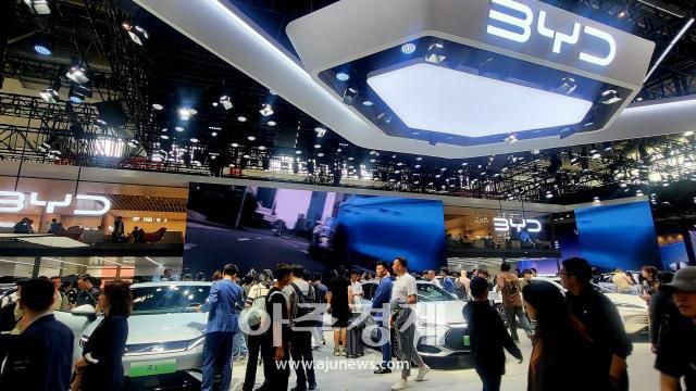 베이징 모터쇼 행사장에 크게 마련된 비야디 부스. [사진=배인선 기자]