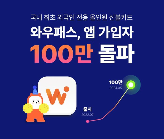 오렌지스퀘어는 외국인 관광객 1위 선불카드 ‘와우패스(WOWPASS)’가 앱 가입자 수 100만명을 돌파했다고 29일 밝혔다. 출시일로부터 약 1년 9개월 만의 기록이다.