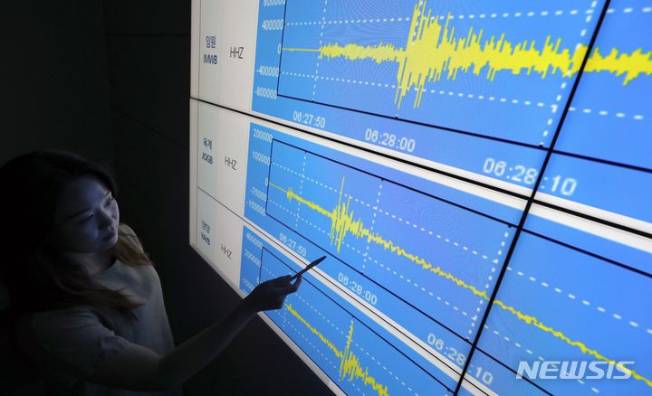 [서울=뉴시스] 김금보 기자 = 지난해 5월15일 서울 동작구 기상청에서 직원이 지진 발생 상황을 살펴보고 있다. 이날 오전 6시27분37초 강원 동해시 북동쪽 52㎞ 부근 해역에서 규모 4.5의 지진이 발생, 지진 위기경보 단계가 ‘관심’에서 ‘주의’로 상향됐다. 규모 4.5 이상 지진이 발생한 건 2021년 12월14일 제주 서귀포시 서남서쪽 41㎞ 해역에서 규모 4.9 지진이 발생한 뒤 1년5개월만으로 올해 발생한 지진 중 가장 규모가 크다. 2023.05.15. kgb@newsis.com