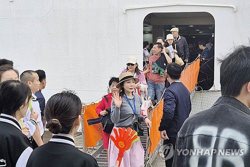 (제주=연합뉴스) 변지철 기자 = 중국 노동절 연휴를 하루 앞둔 30일 오전 제주항에 도착한 중국발 크루즈 드림호(Dream, 7만7천t급)를 타고 온 중국인 관광객이 크루즈선에서 걸어 나오며 환하게 웃고 있다. 2024.4.30