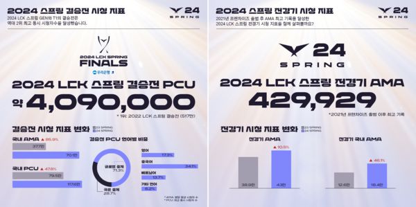 '2024 LCK 스프링' 결승전은 총 408만 9951명의 최고 동시 접속자 수(PCU)를 기록하며 전년(약 372만명) 대비 약 10%의 흥행 상승세를 보였다. 이는 지난 '2022 LCK 스프링'에서 달성한 517만명의 PCU에 이어 역대 두 번째로 높은 수치다.