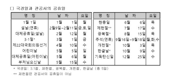 그렇다면 올해 남은 공휴일은 며칠이나 될까? 작년 정부의 발표대로라면 앞으로 남은 공휴일은 다음과 같다.