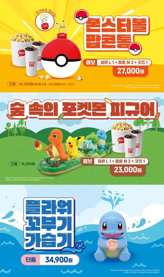 두 번째로 롯데시네마가 특별 제작한 MD 3종을 런칭한다. 영화의 한 장면을 연출한 디오라마 형태의 '숲 속의 포켓몬 피규어'와 영화 속 포켓몬 트레이너들이 사용하는 몬스터볼처럼 가운데를 열어 팝콘을 담을 수 있는 '몬스터볼 팝콘통', 꽃을 든 귀여운 꼬부기가 돋보이는 '플라워 꼬부기 가습기'를 준비했다.