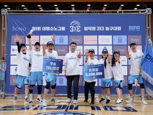 ‘제1회 대명소노그룹 임직원 3X3 농구대회‘ 우승팀 ‘뉴시즌스’가 서준혁 회장(왼쪽에서 네 번째)과 기념 촬영을 진행하고 있다. [사진=소노인터내셔널] |