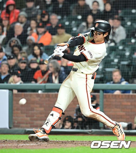 [OSEN=오라클 파크(미국 샌프란시스코), 지형준 기자] 9일(이하 한국시간) 미국 캘리포니아주 샌프란시스코 오라클 파크에서 2024 메이저리그 샌프란시스코 자이언츠와 워싱턴 내셔널스의 경기가 열렸다.올 시즌 샌프란시스코와 6년 1억1300만 달러(약 1530억원)에 계약한 이정후는 10경기 타율 2할5리(39타수 8안타) 1홈런 4타점 3득점 OPS .549를 기록중이다. 데뷔 첫 6경기에서 7안타 1홈런을 몰아쳤지만 이후 4경기에서는 1안타를 기록하는데 그쳤다. 하지만 지난 8일 경기에서 첫 타석부터 안타를 때려내며 3경기 연속 무안타에서 탈출했다. 이날 경기에서는 반등을 노린다.7회말 2사 1루 이정후가 내야땅볼 타구를 날리고 있다. 2024.04.09 /jpnews@osen.co.kr