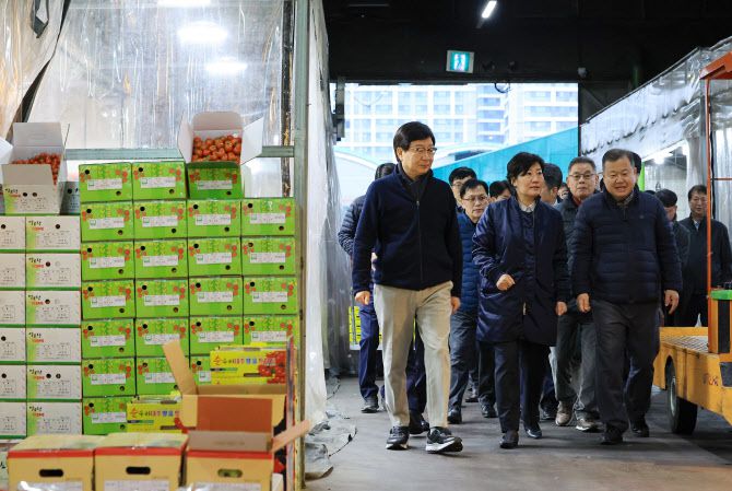 송미령 농림축산식품부 장관이 지난달 서울 송파구 가락시장을 방문해 과일 경매장으로 향하고 있다. (사진=연합뉴스) |