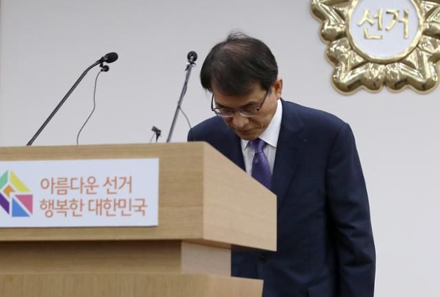노태악 중앙선거관리위원회 위원장은 지난해 5월 31일 오후 경기 과천 선관위에서 고위직 간부 자녀 특혜 채용 의혹 등 관련 특별감사 결과와 후속대책을 발표하며 사과했다. 뉴스1 |