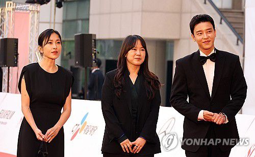 (전주=연합뉴스) 나보배 기자 = 1일 전북 전주시 한국소리문화의전당 모악당에서 열린 제25회 전주국제영화제 레드카펫 행사에서 코리안시네마 부문 '우리 둘 사이에'의 설정환 배우, 성지혜 감독, 오지후 배우(오른쪽부터)가 입장하고 있다. 2024.5.1
