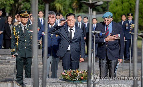 (서울=연합뉴스) 한-호주 외교·국방(2+2) 장관회의 차 호주를 방문 중인 신원식 국방부 장관이 2일 시드니에 위치한 6.25전쟁 참전기념비를 찾아 헌화 후 경례하고 있다. 2024.5.2 [국방부 제공. 재판매 및 DB 금지]