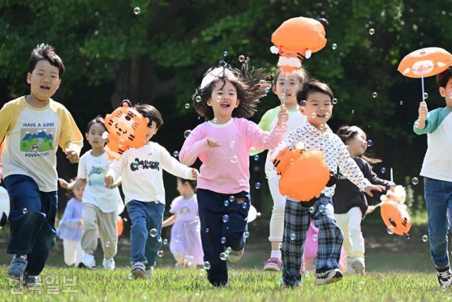 야외학습을 나온 어린이들이 어린이날을 사흘 앞둔 2일 서울 송파구 올림픽공원 한성백제박물관 앞에서 비눗방울 놀이를 하고 있다. 신용주 인턴기자 |