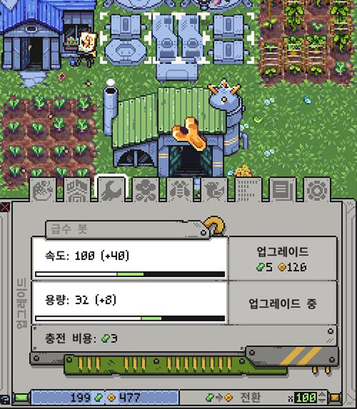▲ 로봇 강화 기능은 각 로봇별로 적용되며, 강화 시마다 비용이 크게 늘어나 농장을 꾸밀 때 부수기엔 아깝고 두기엔 곤란한 상황이 곧잘 있었다 (사진: 게임메카 촬영)