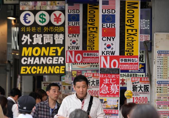 지난달 30일 일본 도쿄에서 행인들이 환전소 사이를 지나고 있다. 도쿄=EPA 연합뉴스
