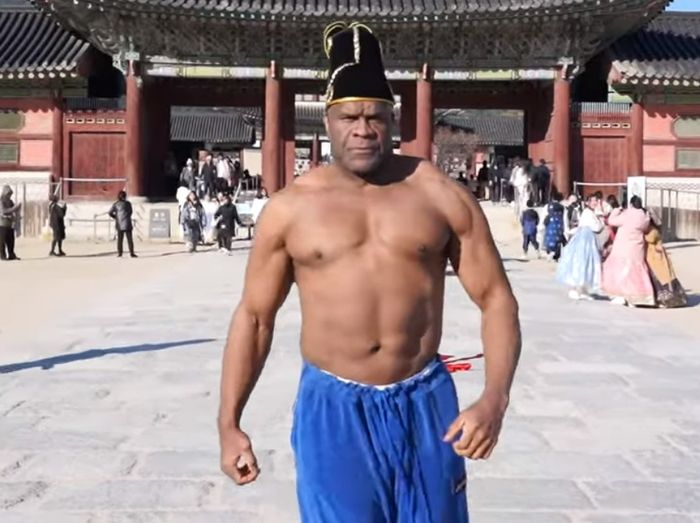 밥 샙이 서울 경복궁에서 유튜브 촬영을 하고 있다.[사진 = ‘헬창TV’ 캡처]