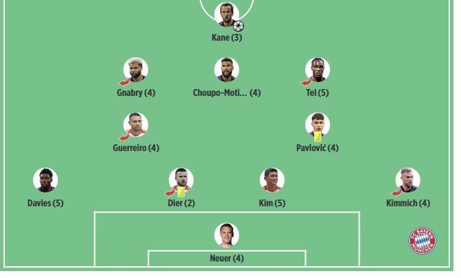 뮌헨은 4-2-3-1로 나섰다. 마누엘 노이어 골키퍼를 세웠고, 알폰소 데이비스, 다이어, 김민재, 하파엘 게헤이루가 수비라인을 구성했다. 허리는 요주아 키미히와 알렉산다르 파블로비치가 받쳤다. 2선엔 세르주 그나브리, 에릭 막심 추포-모팅, 마티스 텔이 이름을 올렸다. 최전방엔 해리 케인이 섰다.