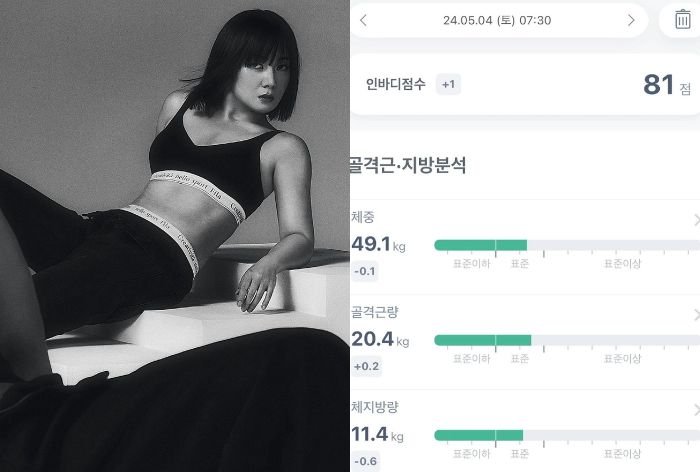 박나래는 바디프로필 촬영 후인 5월4일 기준 체중 49.1kg, 골격근량 20.4kg, 체지방량 11.4kg으로 표준을 안전하게 지키고 있는 인바디 점수를 공개했다.