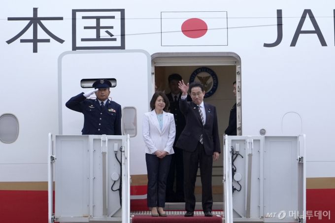 지난달 11일(현지시간) 미국 방문 일정을 마친 기시다 후미오 일본 총리와 부인 유코 여사가 미 메릴랜드주 앤드류스 합동기지에서 워싱턴 일정을 마치고 전용기에 오르며 인사하고 있다.- /사진=AP/뉴시스] |