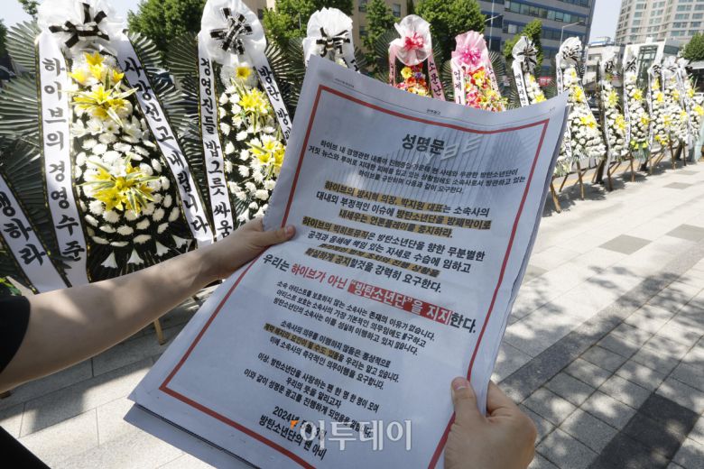 또 4일 '군 복무 중인 아티스트를 방패 삼는 악질 회사', '소속사 여론전에 총알받이 방탄, 이딴 게 소속사냐' 등의 문구가 적힌 시위 트럭과 '개국공신 루머 방치' 등의 문구가 적힌 근조화환을 서울 용산구 하이브 사옥 앞으로 보내기도 했습니다.