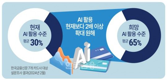 카드사들이 AI인재 육성에 힘쓰는 이유는 AI활용을 확대하고 싶기 때문이다. 한국금융신문의 금융권 CEO(최고경영자) 대상 2024년 AI 활용과 전망 설문조사에서 카드사 수장들은 회사의 AI 활용 수준을 현행(7개사 평균 30%)에서 두 배 이상(희망 평균 65%) 높이고 싶어하는 것으로 확인됐다.