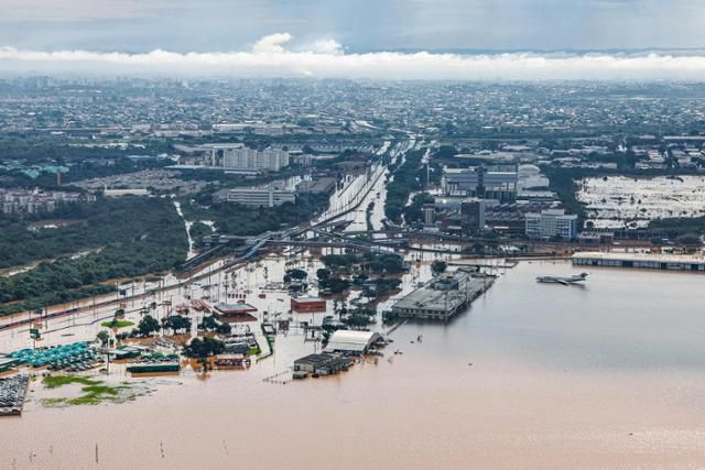 피해는 브라질 최남단 히우그란지두술주(州)에 집중됐다. 강우량이 300㎜ 안팎을 기록한 가운데, 벤투곤사우베스는 일주일 누적 강우량이 543㎜를 넘어섰다. 히우그란지두술 중심 도시인 포르투알레그리에서는 사흘 만에 258.6㎜의 비가 내렸는데, 브라질 기상청은 “평년의 4월(114.4㎜)과 5월(112.8㎜) 강우량을 합친 것보다도 많은 수치”라고 설명했다. 특히 포르투알레그리 인근 과이바강 수위는 5일 오전 7시 기준 1941년(4.76m) 이후 최고치인 5.3m까지 상승했다. 80년 만에 ‘최악의 물 폭탄’이 덮친 셈이다. 주정부는 전역에 비상사태를 선포했다.